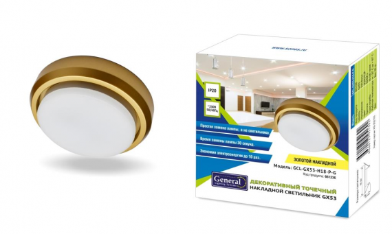 Технические характеристики General lamp 661236 Светильник GCL-GX53-H18-P-G накладной пластиковый