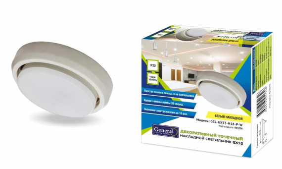 Технические характеристики General lamp 661238 Светильник GCL-GX53-H18-P-W накладной пластиковый
